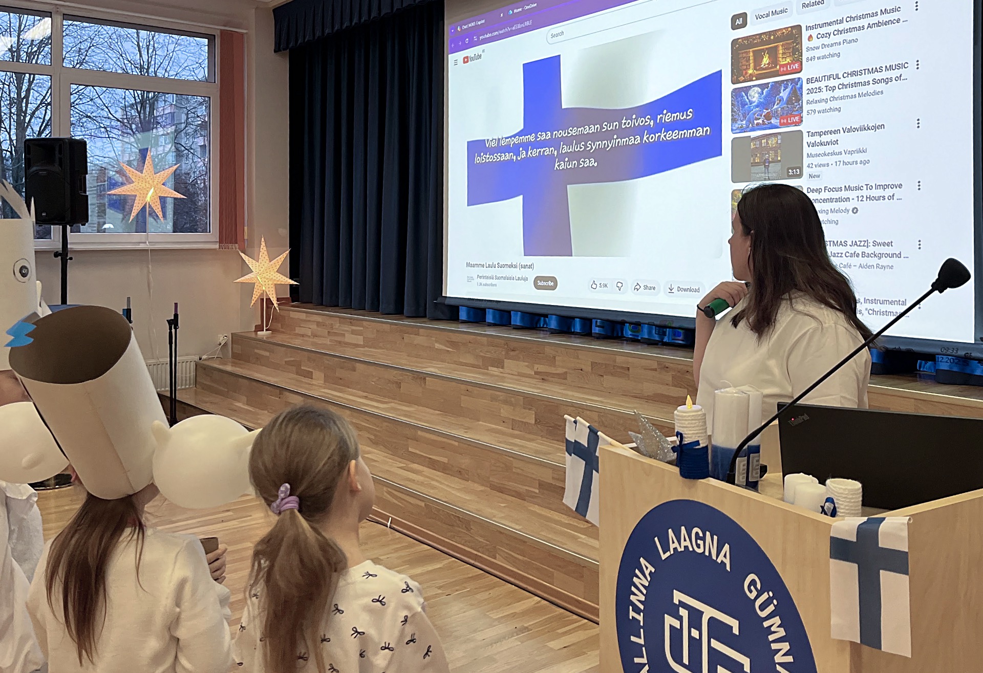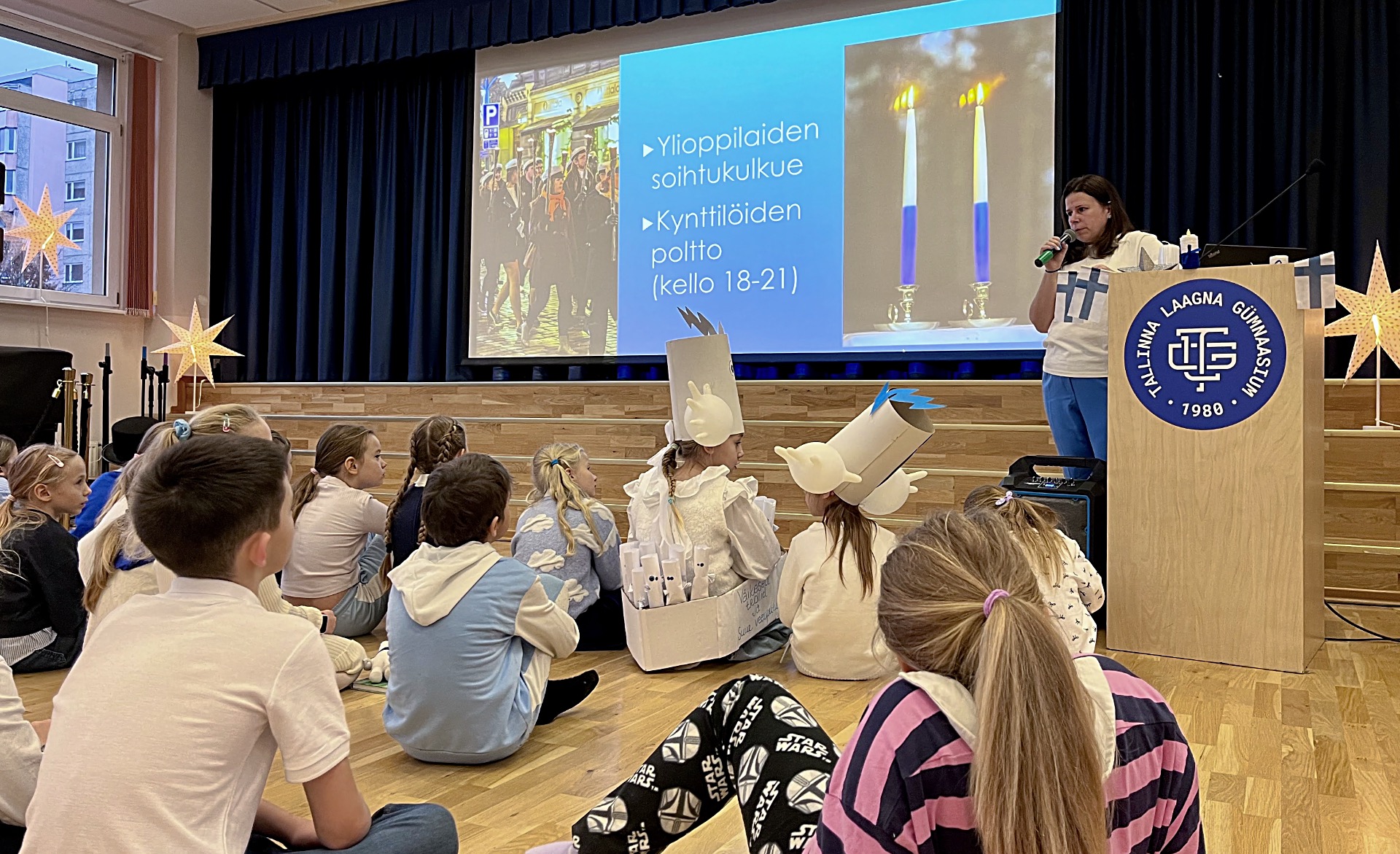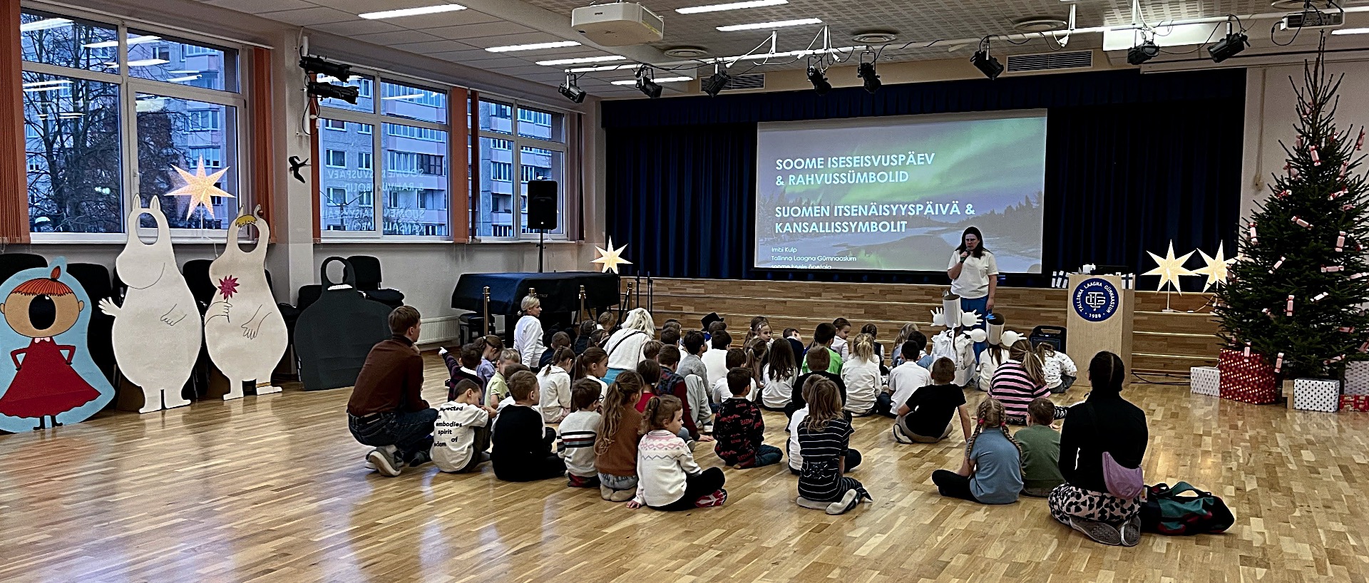 Tallinna Laagna Gümnaasiumis on soome keele õpetaja Imbi eestvedamisel kujunenud Soome iseseisvuspäeva tähistamisest tore ja oodatud traditsioon. Tänavu toimus koolipere ühine pidupäeva tähistamine 5. detsembril, mil koolimaja täitus sini-valgete värvide, Muumide tegelaste ja heatujulise meluga.